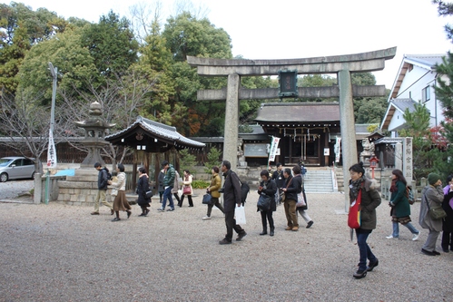 離宮八幡宮では講師から大山崎の油座の話を聞き、日頃見ることのできない重要文化財に指定されている離宮八幡宮文書を見学。受験に大変ご利益のある「油断大敵」お守りを授与。